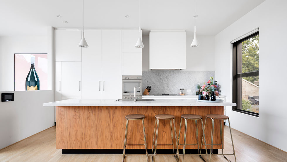 A new house on a 110m2 block in the centre of Fitzroy. Living was reversed to the first floor to maximise the building envelope on ground but more so embrace the northern aspect with town hall views.